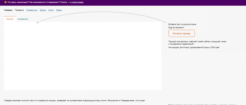 Главред – инструмент для повышения качества текстового контента. Улучшает читаемость и стилистику, помогает очищать текст от словесного мусора, рекламных штампов, канцелярита и ошибочных синтаксических конструкций.