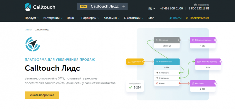 Calltouch Лидс – сервис, позволяющий автоматизировать маркетинг и повысить эффективность работы с различными сегментами аудитории: действующими клиентами, лидами и посетителями, не оставляющими контактов. Помогает подбирать подходящие способы коммуникации с каждой категорией, повышать конверсию сайта и увеличивать уровень продаж.