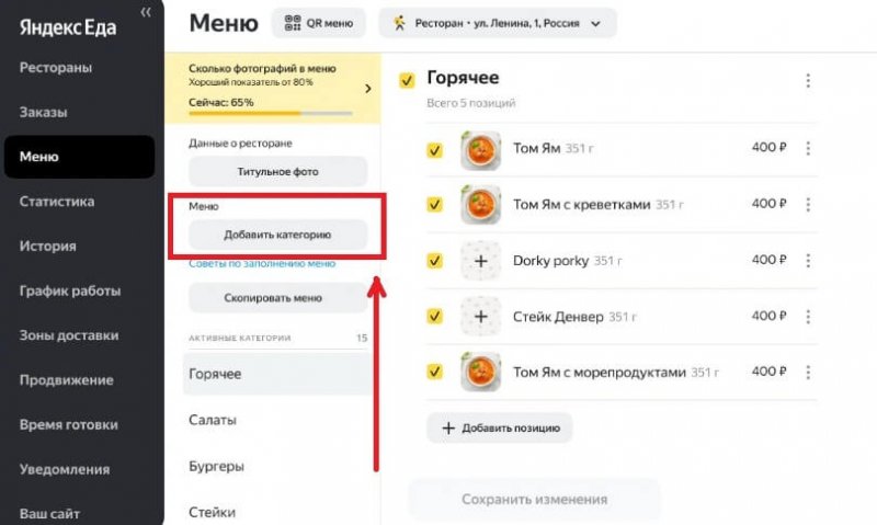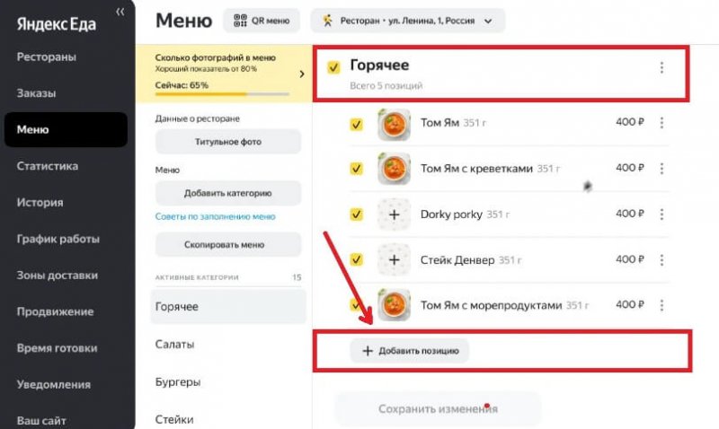 4. Создайте позиции меню и загрузите фото блюд. Откройте нужную категорию и нажмите «Добавить позицию».