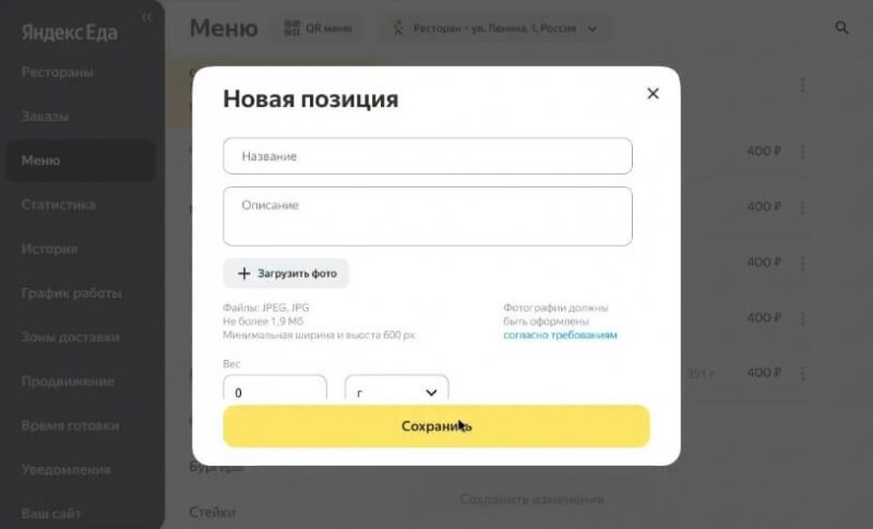 5. Заполните карточку блюда: укажите название, цену, вес, сделайте описание и прикрепите фото. Нажмите «Сохранить».