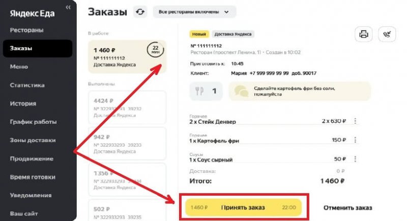 2. Нажмите на заказ, проверьте состав и комментарии. Если вы сможете приготовить и отдать нужные блюда в срок с учетом пожеланий клиента, нажмите «Принять заказ».