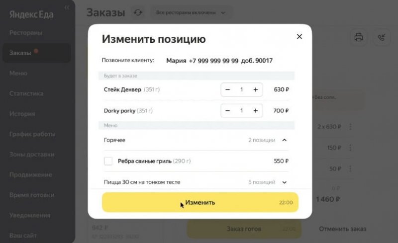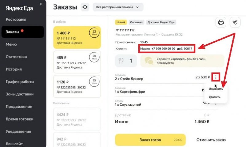 3. Если вы не сможете приготовить одно или несколько блюд из заказа, согласуйте изменения с пользователем. В заказах есть номера телефонов клиентов. Чтобы заменить блюдо, нажмите на три точки справа, выберите «Изменить» и добавьте новую позицию из меню.