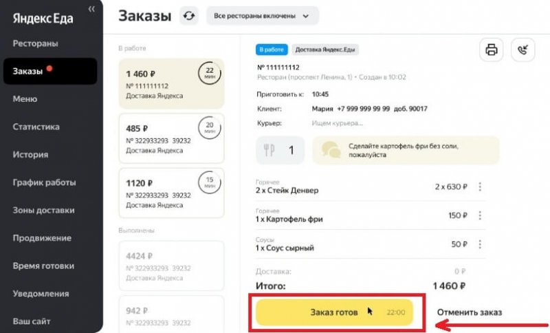 4. Когда заказ будет готов и упакован, нажмите «Заказ готов». Помните, что рестораны, которые выдают заказы без задержек или быстрее положенного времени, поднимаются выше в поиске сервиса.