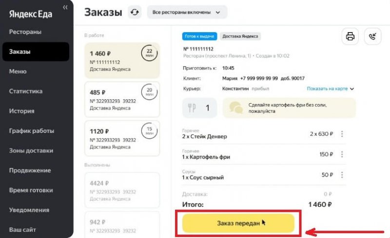 5. После выдачи заказа курьеру нажмите «Заказ передан».