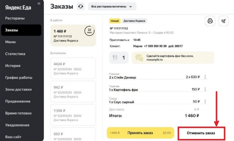 6. Если вы не сможете выполнить заказ, нажмите «Отмена заказа». Этой функцией лучше пользоваться только в крайнем случае. После отмены одного заказа ваш ресторан на некоторое время исчезнет из поисковой выдачи Яндекс Еда. А частые отмены снижают позиции заведения в поиске и провоцируют негативные отзывы.