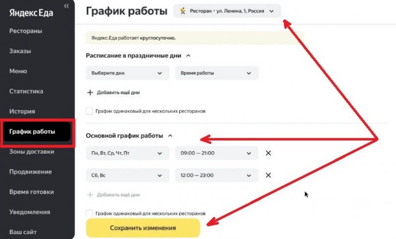 6. Подготовьте фотографии и описания блюд. Загрузите меню, режим работы ресторана и время выдачи заказов. Как работать в личном кабинете Яндекс Еда, подробно расскажем далее. Когда все будет готово, нажмите кнопку запуска ресторана в личном кабинете.