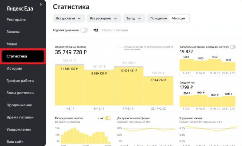 Яндекс Еда предъявляет к ресторанам ряд требований. Нужно соблюдать стандарты работы, успевать готовить заказы максимум за 60 минут, вовремя актуализировать меню и стоп-листы. От скорости выдачи и качества блюд зависит позиция заведения в поиске сервиса. За свои услуги площадка берет комиссию.