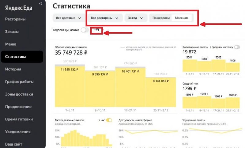 2. Выберите ресторан, период и формат отчета. Если хотите получить статистику в виде Exel-файла, нажмите на значок письма. Сервис отправит информацию на электронную почту.