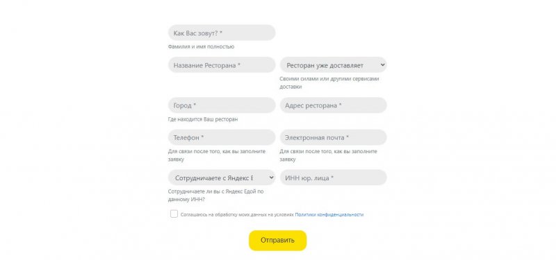 Яндекс Еда – это сервис доставки готовых блюд из кафе и ресторанов. Помогает общепиту получать больше заказов. При этом не требуется нанимать дополнительный персонал, увеличивать затраты на рекламу или количество посадочных мест в зале. Подготовили пошаговую инструкцию, как подключить своё кафе или ресторан к Яндекс Еде, загрузить меню и начать принимать первые заказы. Расскажем о преимуществах партнерства с Яндекс Еда. Реклама: 2VtzquY3wEz Что дает партнерство К Яндекс Еда подключаются заведения общепита любого формата. Если у вас пиццерия, стейк-хаус, кондитерская или ресторан авторской кухни, вы можете сотрудничать с площадкой. Сервис окажет маркетинговую поддержку, возьмет на себя доставку блюд и разбор спорных ситуаций с клиентами. Работать можно через веб-версию личного кабинета или мобильное приложение. Преимущества работы с сервисом Яндекс Еда: Охват широкой аудитории. Сервис продвигается с помощью наружной и интернет-рекламы. Яндекс активно развивает собственную экосистему, в том числе доставку еды. Вы получите доступ к многомиллионной аудитории без дополнительных затрат на рекламу. О вас узнают новые клиенты. Больше заказов от постоянных гостей. Ваши постоянные клиенты смогут заказывать доставку любимых блюд. Это удобно, когда нет времени или желания идти в ресторан. Сообщите гостям, что ваше заведение есть на Яндекс Еда. Для этого после регистрации в сервисе добавьте кнопку на сайт. Доступ к лояльной аудитории сервисов Яндекса. Рестораны-партнеры площадки могут подключиться к программе лояльности Яндекс Плюс Кешбэк. Участники получают баллы за заказы во всех сервисах Яндекса и могут потратить их на покупки в Яндекс Еда. Это лояльная аудитория, которая заказывает доставку чаще других пользователей. Значок программы лояльности выделяет ресторан в поиске Повышенная загрузка кухни. Количество заказов в Яндекс Еда не зависит от вместимости вашего зала. Персонал не будет простаивать, а продукты не испортятся. Продвижение ресторана внутри площадки. Акции и скидки для пользователей сервиса помогут увеличить продажи и улучшить позиции ресторана в поиске. Экономия на зарплате курьеров и быстрая доставка. Вам не придется содержать штат собственных курьеров. Персонал Яндекс Еда доставит любое количество заказов в радиусе 4–10 км. Среднее время доставки, по данным Яндекса – 32 минуты. Яндекс Еда предъявляет к ресторанам ряд требований. Нужно соблюдать стандарты работы, успевать готовить заказы максимум за 60 минут, вовремя актуализировать меню и стоп-листы. От скорости выдачи и качества блюд зависит позиция заведения в поиске сервиса. За свои услуги площадка берет комиссию. Как стать партнером Яндекс Еда: подробное руководство По умолчанию к сервису могут подключиться рестораны в городах присутствия Яндекс Еда. Проверить доступность площадки в вашем городе можно на сайте. В официальной Справке Яндекс заявляет, что они рассматривают заявки на подключение из любых городов. Но если сервиса в вашем населенном пункте нет, то доставлять заказы нужно будет собственными силами. Такие заявки рассматриваются в индивидуальном порядке. Перед подключением к сервису ознакомьтесь с офертой. Как подключить ресторан к Яндекс Еда 1. Заполните заявку на специальном ресурсе. 2. Ожидайте обратной связи от менеджеров сервиса. Яндекс п