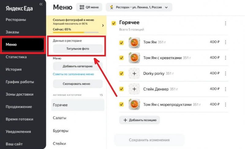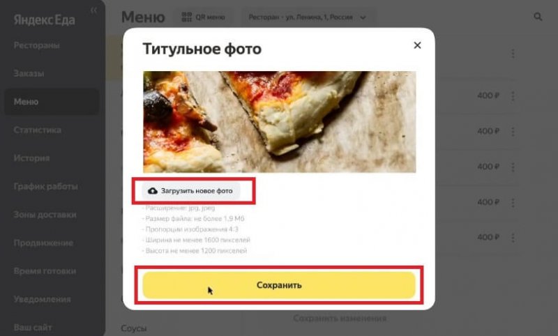 1. Добавьте титульное фото ресторана – это изображение, которое увидят пользователи на странице поиска. Откройте раздел «Меню» и нажмите «Титульное фото».