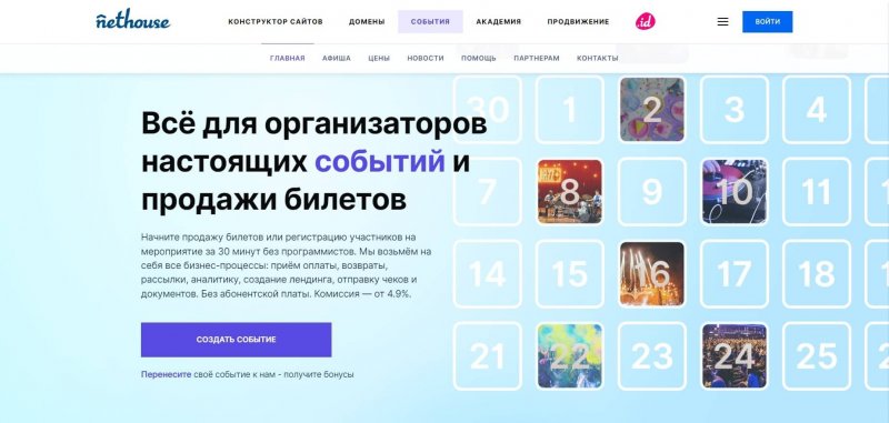 Нетхаус – конструктор сайтов, позволяющий при помощи шаблонов создавать лендинги событий и запускать продажи билетов. Из личного кабинета организатор настраивает форму регистрации, указывает время и дату закрытия продаж, доступные способы платежей и другие параметры.