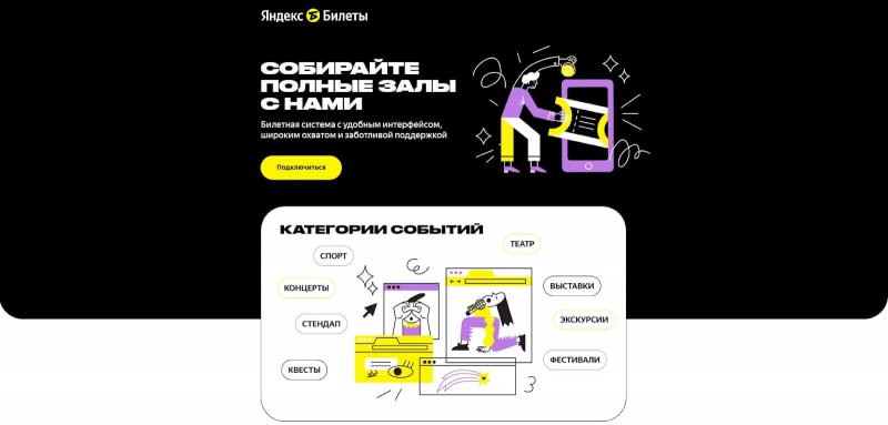 Сервис «Яндекс.Билеты» представляет собой систему для организации продаж билетов на мероприятия любого типа. Все события попадают на Яндекс.Афишу – крупнейший билетный агрегатор в России, с посещаемостью более 9 млн человек в месяц.