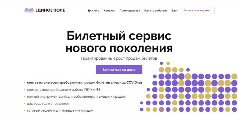 Сервис «Единое поле» помогает организовать продажу онлайн билетов в театры и филармонии, на музыкальные концерты, фестивали, спортивные мероприятия, шоу, экскурсии и туристические поездки. Подходит как для частных компаний, так и для государственных учреждений, позволяет настроить работу в соответствии с требованиями ФЗ-54.