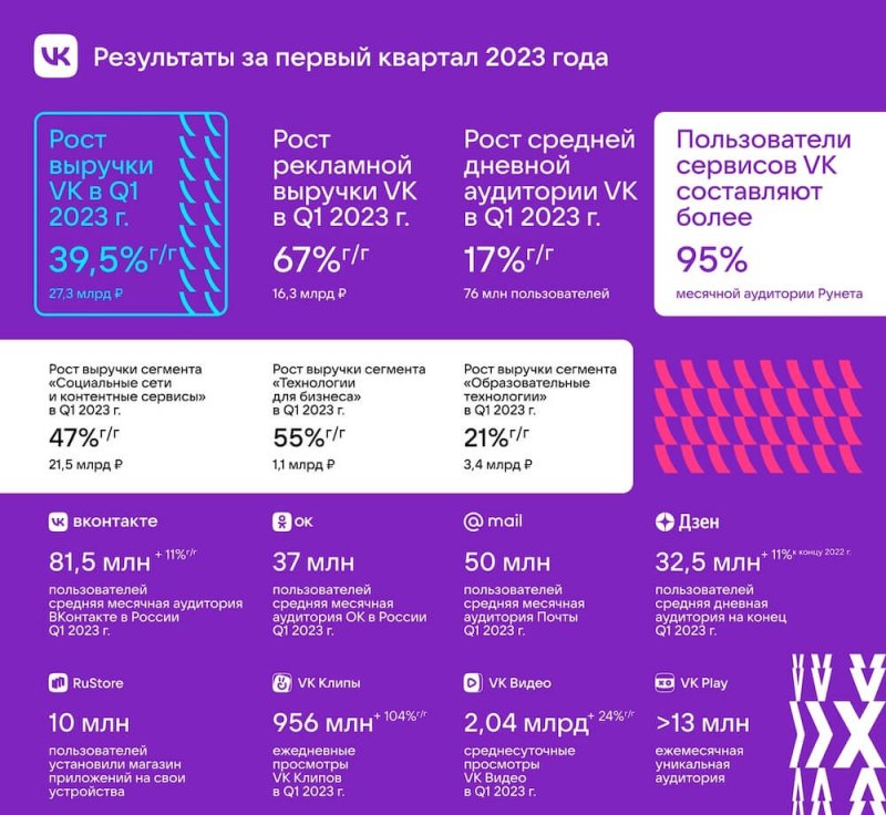 По состоянию на конец первого квартала 2023 года пользователи сервисов VK составляют более 95% месячной аудитории Рунета.