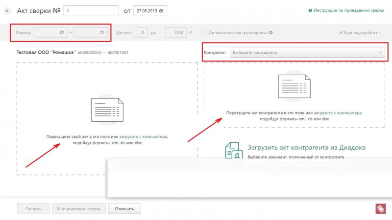 2. Заполните форму: укажите период, выберите контрагента, загрузите акты в формате Exel (вашу версию и документ партнера). Если контрагент тоже пользуется Диадок, он может сформировать свой акт в сервисе и прислать вам.