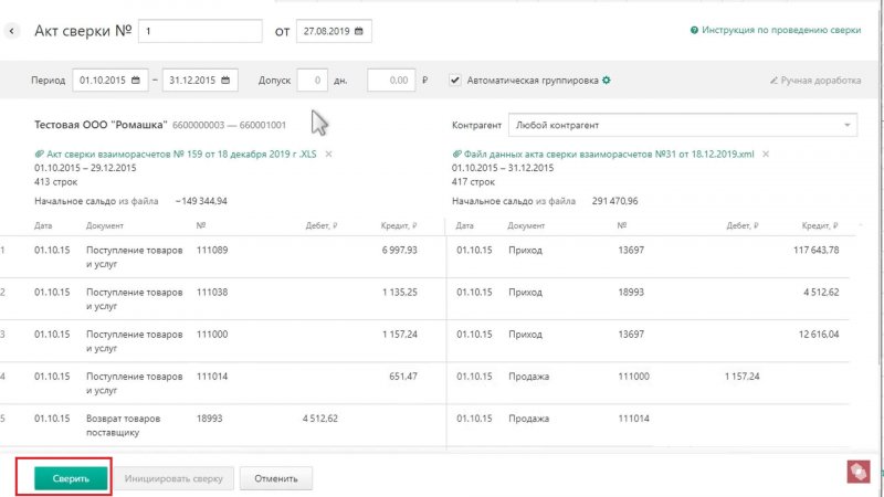 3. Нажмите «Сверить» внизу под формой акта – система сопоставит данные и укажет на расхождения.