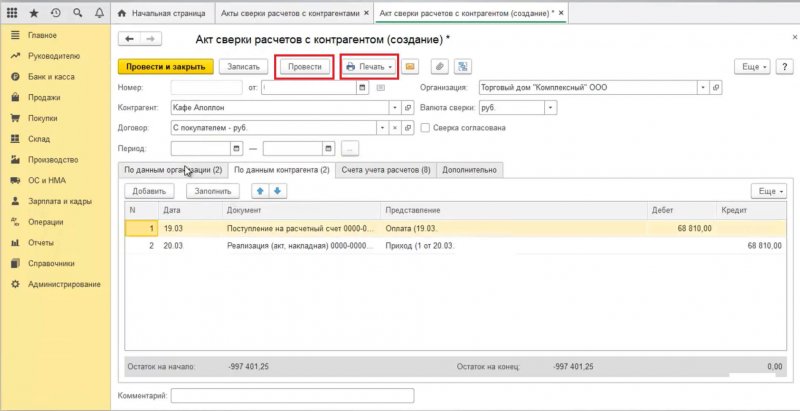3. Нажмите «Провести», а затем «Печать», чтобы сохранить или распечатать готовый акт сверки.