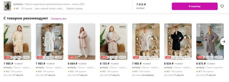 В личном кабинете продавца на WB настройте блок «С товаром рекомендуют». Сюда можно добавить вашу продукцию из смежных категорий. Например, порекомендуйте покупателям приобрести к джинсам футболку или рубашку.