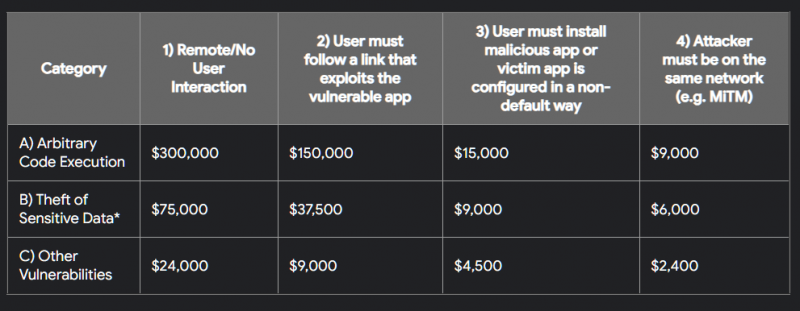 Так, за уязвимости, которые могут привести к удаленному выполнению кода без взаимодействия с пользователем теперь можно получить 300 000 долларов США. А за проблемы, связанные с кражей конфиденциальных данных, компания будет платить до 75 000 долларов, если эксплоиты не требуют вмешательства пользователя и могут использоваться удаленно.